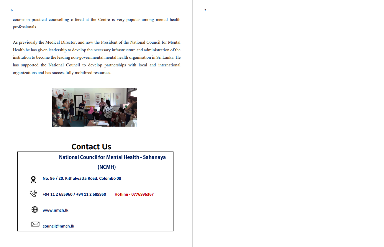 Through advocacy Dr. Mendis has made every attempt to bring mental health out of isolation to the fore of public discourse. He has, consequently, promoted the mobilisation of funds for mental health, and helped greatly to integrate mental health into other sectors including health, education, social care and management. Research and Development Dr Mendis has provided opportunities at the resource centre for academics, researchers, professionals and students to engage in research and training on mental health. International and local students use this facility. Following the tsunami of 2004, he collaborated with researchers in Israel and Japan on research in mental health. Institutional strengthening and capacity development As medical director he took the leadership in developing and managing all professional activities and programmes at the National Council for Mental Health. As its President he has initiated several programmes on professional mental health education and training. During their regular attachments at the community mental health centre in Colombo, psychiatric trainees, general practitioners, medical students, and nurses are given a special training in assessment and care of persons with mental disorder for them to practice in different settings. In addition other categories of personnel working with individuals with mental disorders, such as social workers, occupational therapists and community workers are also given appropriate training. A Diploma 6 course in practical counselling offered at the Centre is very popular among mental health professionals. As previously the Medical Director, and now the President of the National Council for Mental Health he has given leadership to develop the necessary infrastructure and administration of the institution to become the leading non-governmental mental health organisation in Sri Lanka. He has supported the National Council to develop partnerships with local and international organizations and has successfully mobilized resources. Contact Us No: 96 / 20, Kithulwatta Road, Colombo 08 +94 11 2 685960 / +94 11 2 685950 Hotline - 0776996367 www.nmch.lk council@nmch.lk