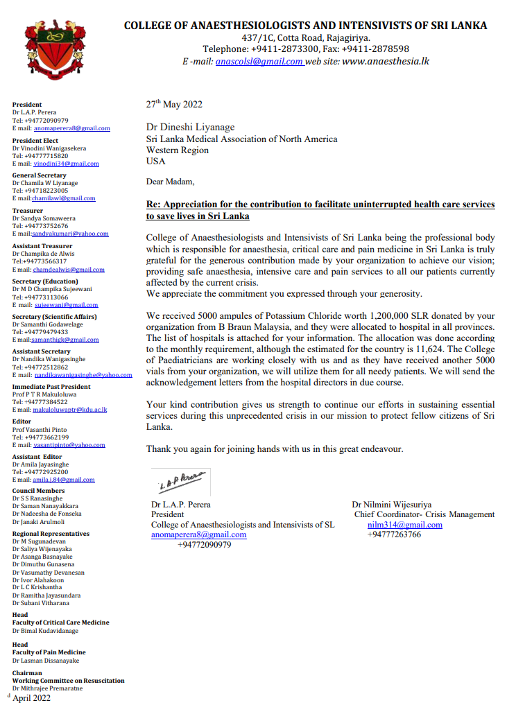 5-26-22 - Emergency medicine - 10,000 ampules of Potassium Chloride delivered to the College of Anaesthersiologists & the College of Paediatricians
